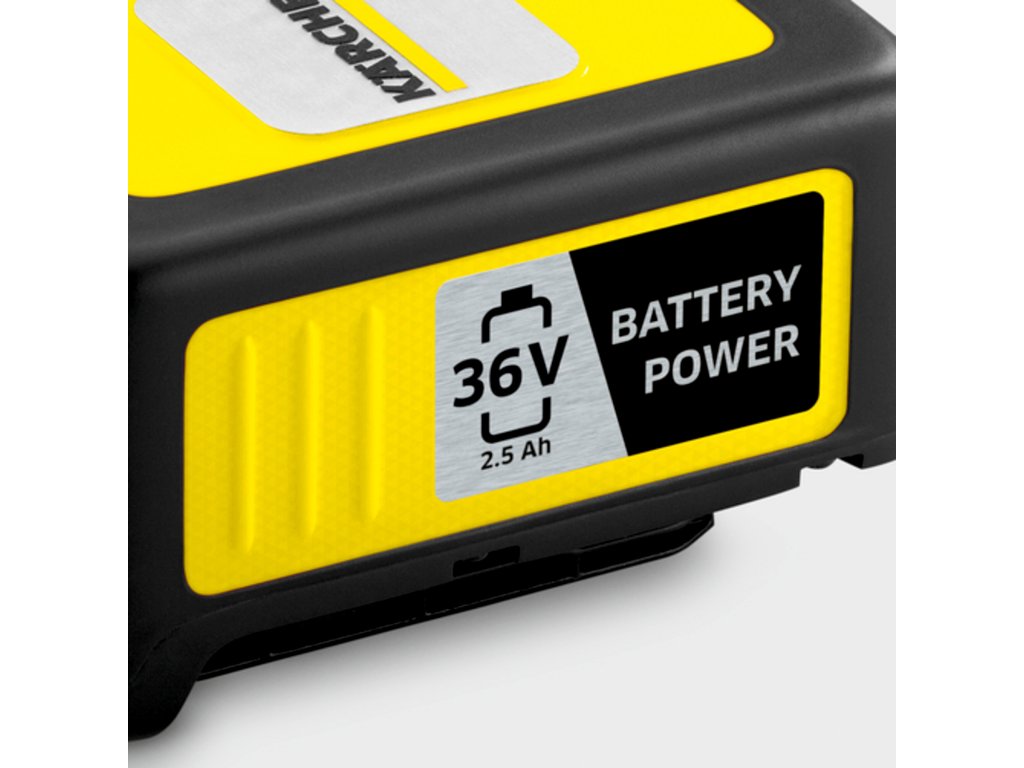 Vyměnitelná baterie Kärcher 36 V / 2,5 Ah je vhodná pro použití ve všech zařízeních platformy Kärcher 36 V Battery Power. Díky Real Time Technology s LCD displejem je vždy zobrazena zbývající provozní doba, zbývající doba nabíjení a stav nabití - v závislosti na použitém zařízení. Vysoce výkonné lithium-iontové články poskytují konzistentní výkon a zajišťují, že se akumulátor nevyprázdní nebo neztratí svou kapacitu v důsledku častého částečného vybití (paměťový efekt).