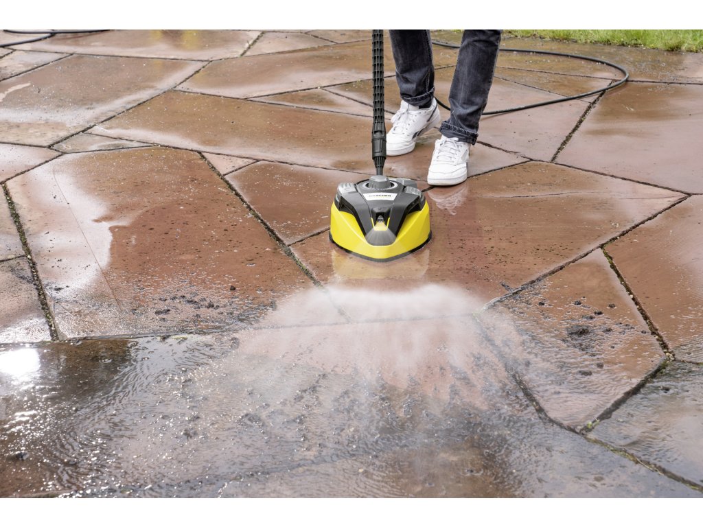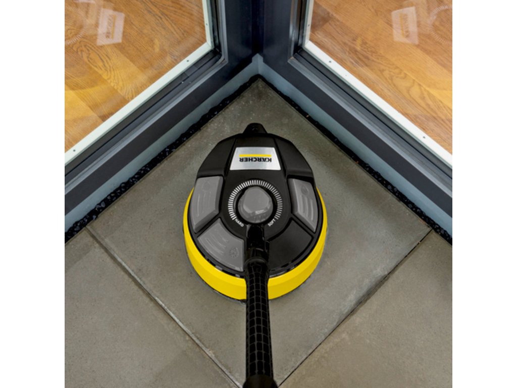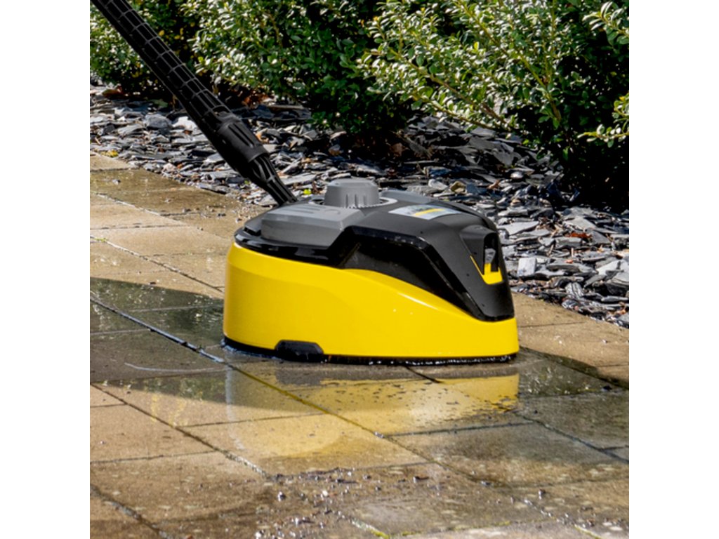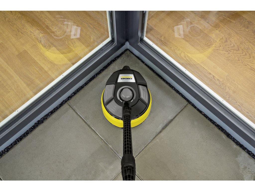 Čistič ploch T 7 Plus je účinným nástrojem pro čištění vnějších ploch bez zpětného stříkání. Otočné rameno s dvojitým paprskem odstraňuje nečistoty z velkých ploch, což šetří cca. 50% vašeho času ve srovnání s čištěním pomocí stříkací trubice. Přidání výkonové trysky také zaručuje účinné čištění v rozích a na okrajích. Díky integrované oplachovací trysce se uvolněné nečistoty jednoduše zbaví vyčištěného povrchu - ušetří se tak čas a úsilí. Tvrdé plochy, jako je kámen a beton, a jemnější plochy, jako je dřevo, lze vyčistit úpravou vzdálenosti mezi tryskou a povrchem, který má být čištěn. Díky vznášedlovému efektu je čistič ploch velmi snadno ovladatelný. Různé funkce se volí jednoduše pomocí nožního spínače. Díky svému praktickému držadlu lze pomocí blesku vyčistit i svislé plochy, jako jsou garážová vrata. Vhodné pro tlakové myčky v rozsahu K4 až K7.