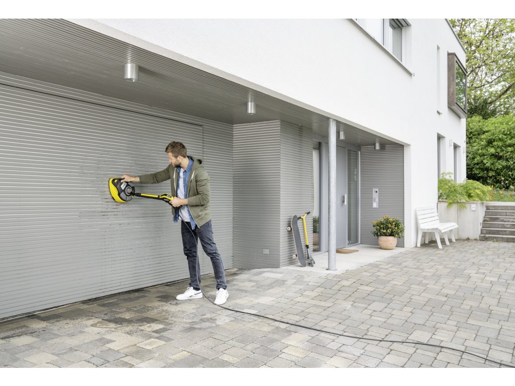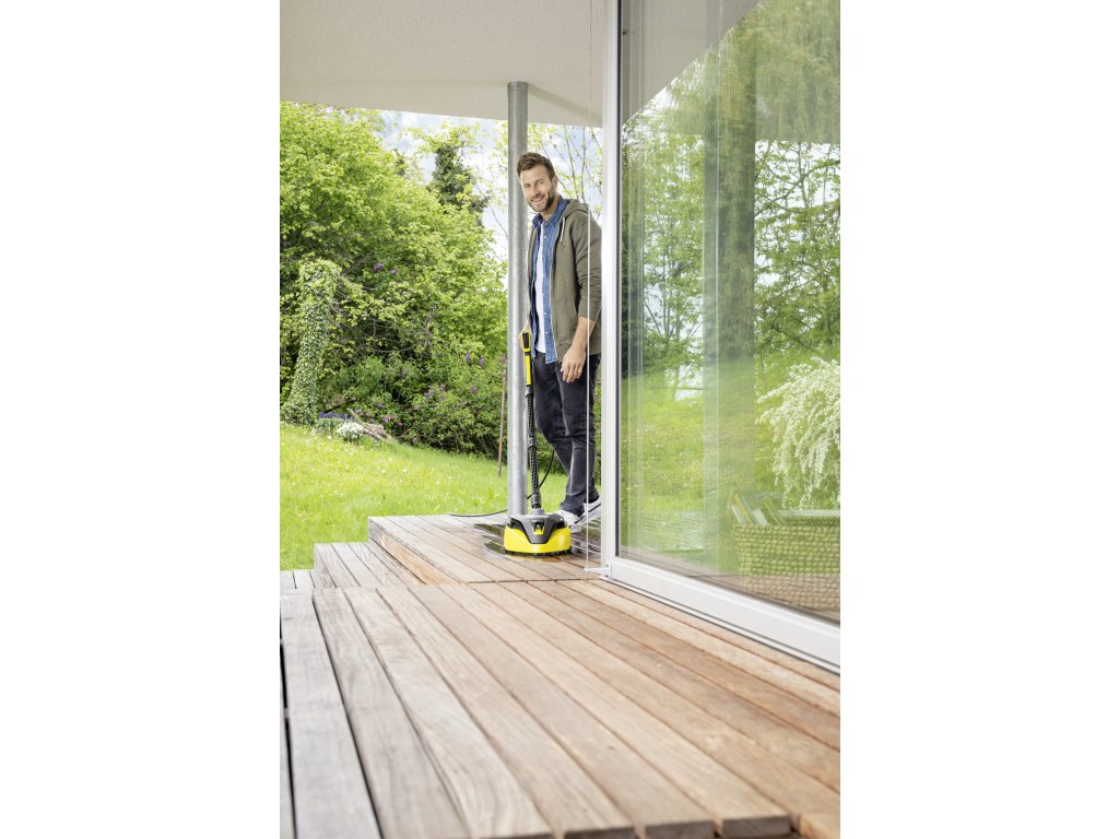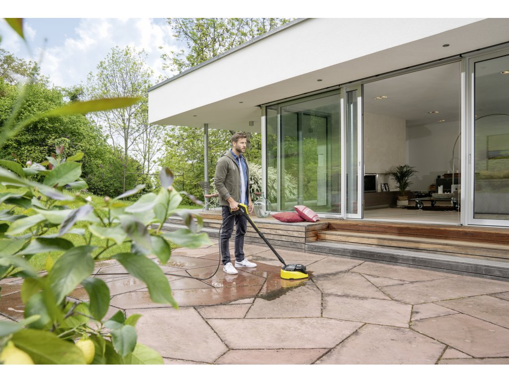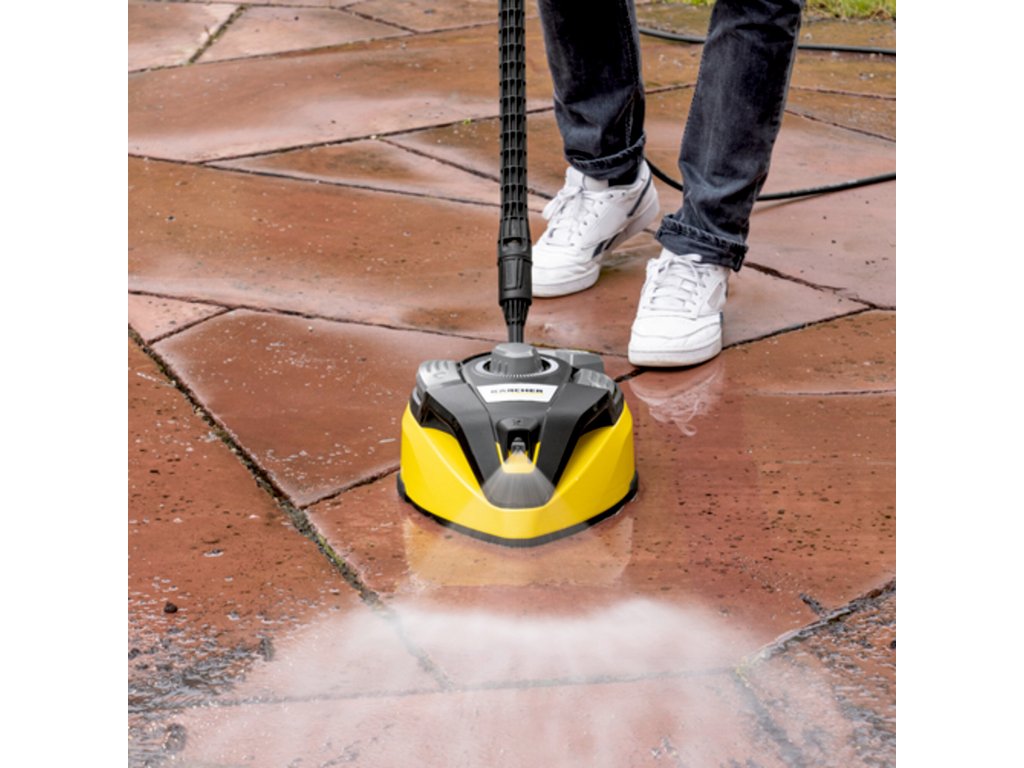 Čistič ploch T 7 Plus je účinným nástrojem pro čištění vnějších ploch bez zpětného stříkání. Otočné rameno s dvojitým paprskem odstraňuje nečistoty z velkých ploch, což šetří cca. 50% vašeho času ve srovnání s čištěním pomocí stříkací trubice. Přidání výkonové trysky také zaručuje účinné čištění v rozích a na okrajích. Díky integrované oplachovací trysce se uvolněné nečistoty jednoduše zbaví vyčištěného povrchu - ušetří se tak čas a úsilí. Tvrdé plochy, jako je kámen a beton, a jemnější plochy, jako je dřevo, lze vyčistit úpravou vzdálenosti mezi tryskou a povrchem, který má být čištěn. Díky vznášedlovému efektu je čistič ploch velmi snadno ovladatelný. Různé funkce se volí jednoduše pomocí nožního spínače. Díky svému praktickému držadlu lze pomocí blesku vyčistit i svislé plochy, jako jsou garážová vrata. Vhodné pro tlakové myčky v rozsahu K4 až K7.