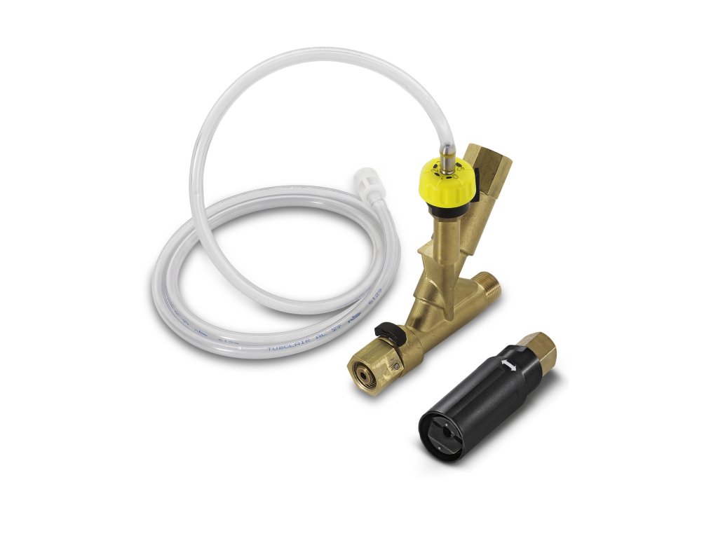 Vysokotlaký pěnovací set, kompletní k provozu, pro mobilní a stacionární HD/HDS stroje pro čištění a dezinfekci. Pěnovací tryska pro připojení na vysokotlaký nástavec + vysokotlaký injektor čisticích prostředků s přesným dávkovacím ventilem 0-5%. Sady trysek pro různé řady přístrojů (viz Sady trysek) je nutné objednat samostatně.