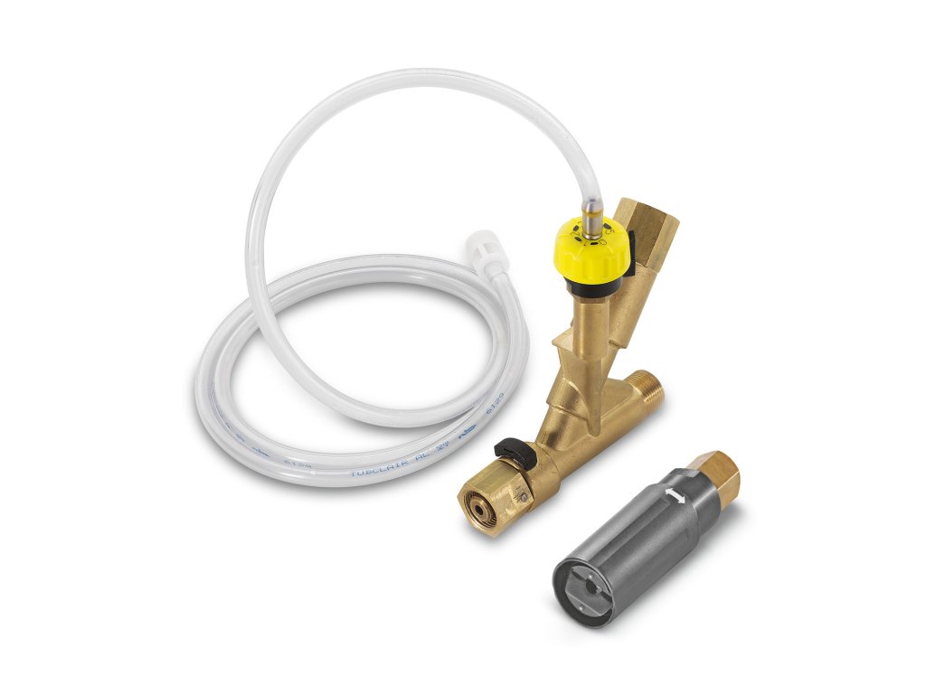 Vysokotlaký pěnovací set, kompletní k provozu, pro mobilní a stacionární HD/HDS stroje pro čištění a dezinfekci. Pěnovací tryska pro připojení na vysokotlaký nástavec + vysokotlaký injektor čisticích prostředků s přesným dávkovacím ventilem 0-5%. Sady trysek pro různé řady přístrojů (viz Sady trysek) je nutné objednat samostatně.