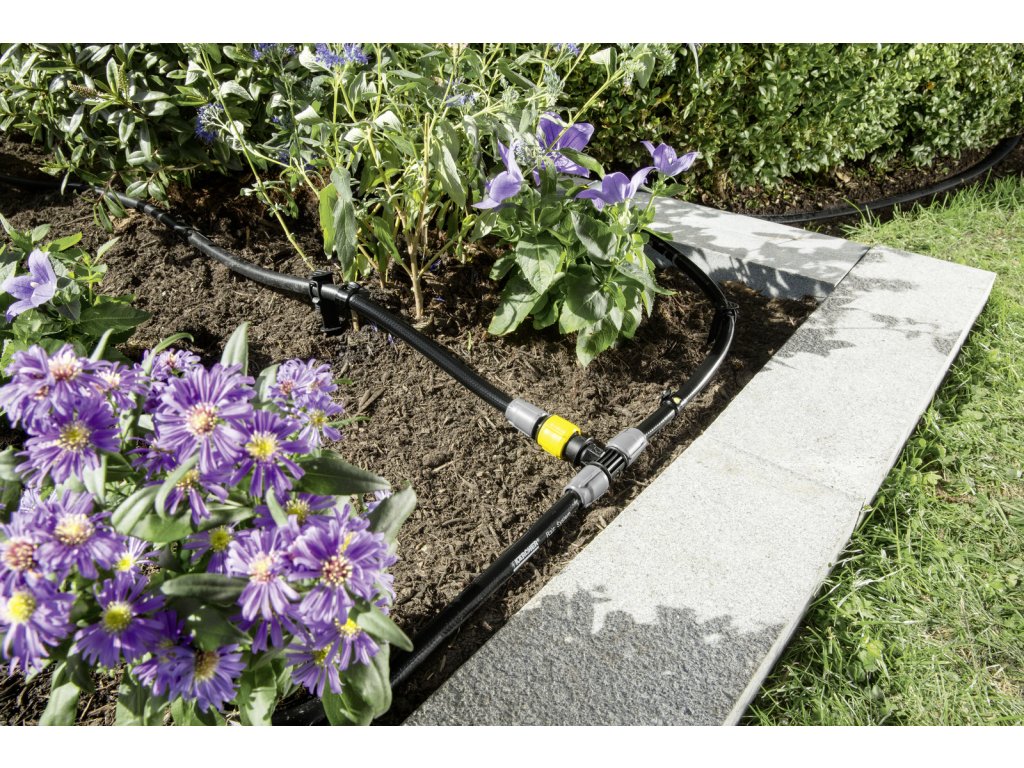 Hadice systému Kärcher Rain System® je hlavní součástí tohoto systému. Dodává rovnoměrně vodu v rámci celého systému. Na hadici lze optimálně připevnit manžety pro kapénkovou závlahu a postřik. Hadici lze podle potřeby zkrátit, pomocí I-dílů prodloužit a díky T-dílům i rozdvojit. Na konec hadice můžete připevnit např. hadici pro kapénkovu závlahu. Hadice systému Kärcher Rain System® je dlouhá 10 m. Tlaku odolná tkaná výztuž hadice je vyrobena z materiálů bez ftalátů, kadmia, baria a olova, a proto je zcela zdravotně nezávadná. Vnější vrstva s anti-UV filtrem je odolná proti povětrnostním vlivům, chrání materiál hadice a neprůhledná mezivrstva zabraňuje tvorbě vodních řas v hadici. Montáž hadice je velice jednoduchá a není k ní potřeba žádného nářadí. Kärcher Rain System® spojuje výhody mikroodkapávání a běžného zavlažování, pracuje pod tlakem až 4 bar a je vybaven 1/2"-hadicí s manžetami pro kapénkovou závlahu a postřikovacími manžetami. Kärcher Rain System® spojuje výhody mikroodkapávání a běžného zavlažování, pracuje pod tlakem až 4 bar a lze jej přizpůsobit téměř jakémukoliv typu zahrady.