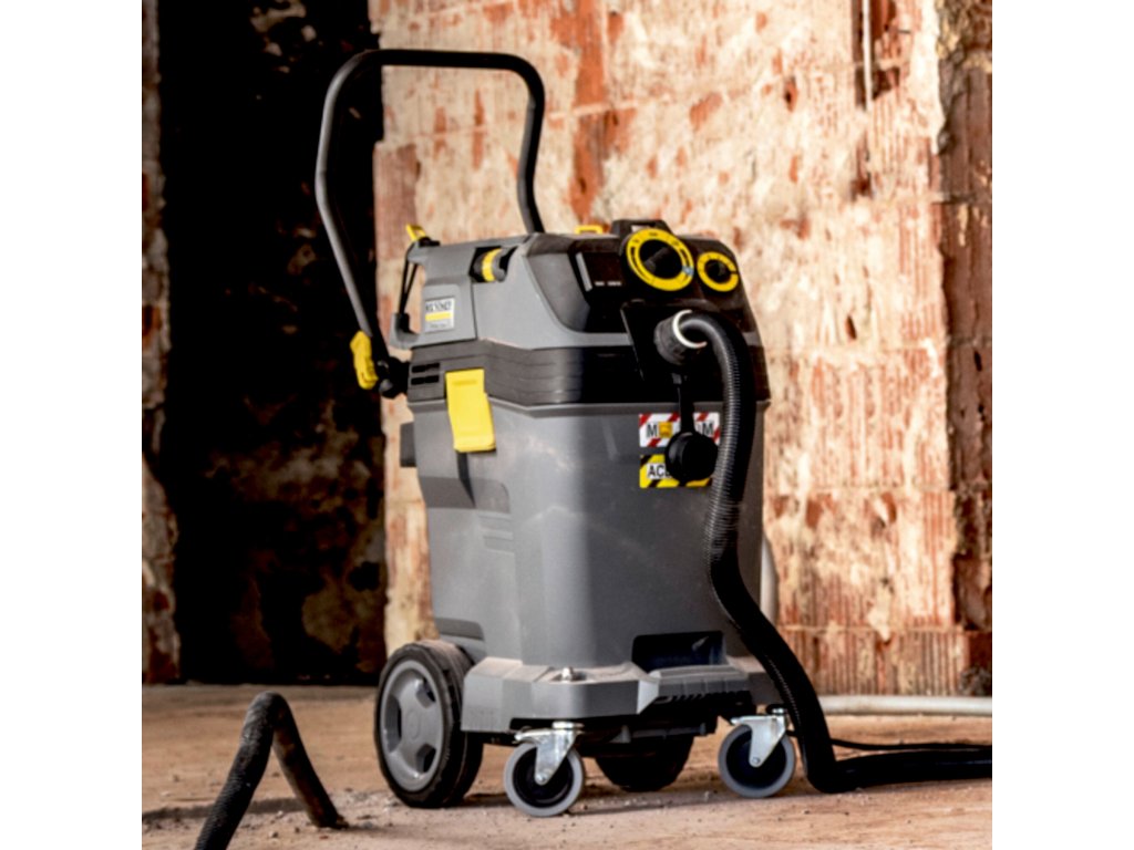 Díky novému systému čištění filtru řízenému senzory Tact vysává vysavač NT 50/1 Tact Te M ACD extrémní množství jemného prachu a zároveň zaručuje účinnost filtrace 99,9 %. Stroj je certifikován podle nové normy ACD v souladu s normou IEC 60335-2-69:2021 a je schválen pro vysávání hořlavého prachu. Sací výkon je neustále monitorován senzory a čištění filtru je řízeno podle potřeby. Robustní 50litrová nádoba s kovovými kolečky, nastavitelnou rukojetí a vypouštěcí hadicí si poradí i s velkým množstvím jemného prachu třídy prachu M, stejně jako s hrubými nečistotami a kapalinami. Vypouštěcí hadice usnadňuje likvidaci velkého množství kapaliny. Pro přímé odsávání u elektrického nářadí má integrovanou zásuvku s funkcí automatického spuštění a kompletní antistatický systém s el. vodivým příslušenstvím. Již usazený prach je spolehlivě vysáván sadou příslušenství (4m sací hadice, sací trubky z nerezové oceli, široká podlahová hubice). Veškeré příslušenství lze bezpečně uložit přímo na stroji díky chytrým úložným řešením.