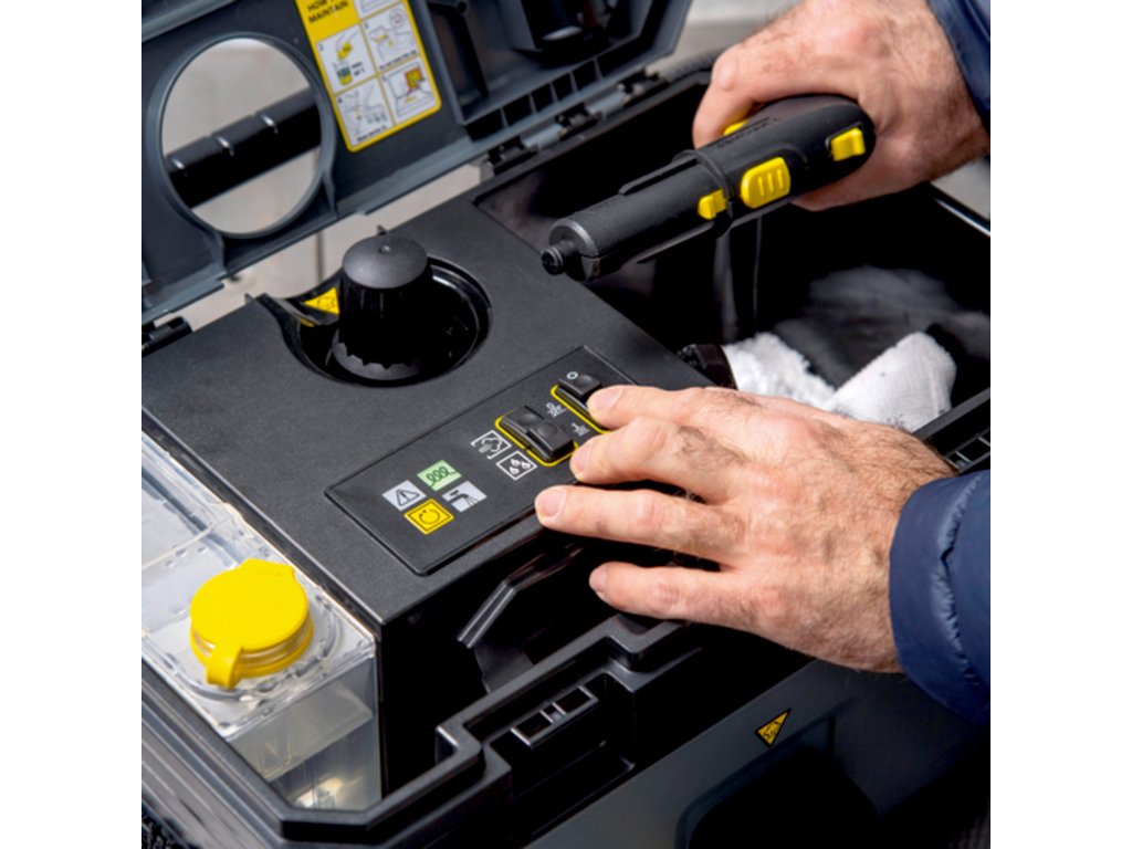 Díky jedinečné konstrukci all-in-one boxu je velmi kompaktní, robustní a odolný, je také rozsáhle vybavený a velmi snadno se používá: Parní čistič SG 4/2 Classic přesvědčí vynikajícími výsledky čištění, skvělá cena/ poměr výkonu a maximální efektivita. Lehký stroj, vážící pouhých 7,5 kilogramů, je nejkompaktnějším profesionálním parním čističem ve své třídě, je připraven k použití za pouhé 3 minuty a s tlakem páry 4 bary nabízí více než dostatečné rezervy pro hloubkové čištění a sanitaci bez použití chemikálií. Pulty, dávkovací zařízení, dlaždice, varné desky, trouby a mnohé další jsou pečlivě vyčištěny přímo do té nejmenší skuliny – bez ohledu na úroveň znečištění. Ve zvláště odolných případech pomáhá připojitelná funkce VapoHydro s horkou vodou a účinně odstraňuje silné znečištění a mastnotu, nádržku na vodu lze kdykoli vyjmout a naplnit. Příslušenství jako parní hadice, ruční hubice, bodová tryska, Power hubice, kulatý kartáč, plochý kartáč, škrabka a kryt z mikrovlákna, to vše je uloženo přímo ve stroji – volitelně je k dispozici i podlahová hubice.