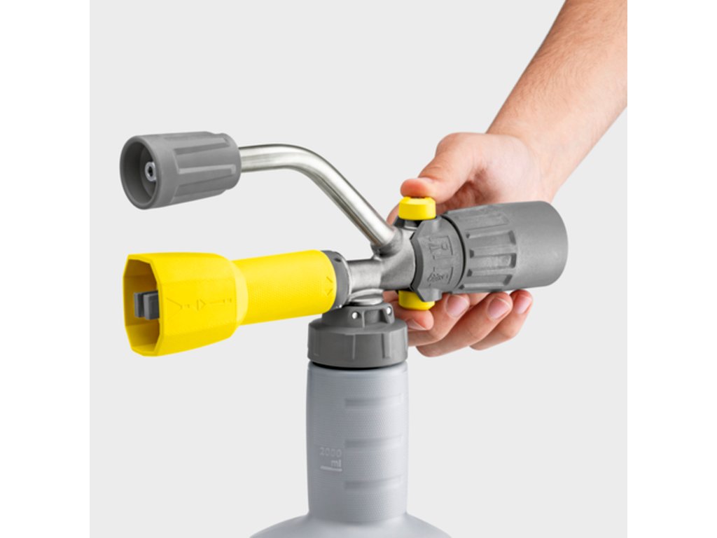 S pěnovací tryskou DUO Advanced 2 poskytuje Kärcher dokonalé řešení pro úklidové práce s tlakovými čističi, které mají průtok 700 až 800 l/h, ale nemají Servo Control. Pěnovací tryska umožňuje uživateli okamžitě přejít na vysokotlaký provoz. Díky robustnímu tělu s odolným niklovým povlakem se také ideálně hodí pro použití s agresivními čisticími prostředky, které lze přepravovat díky robustní dvoulitrové nádrži s velkým plnicím otvorem a přídavným madlem zabudovaným v hrdle. Úhel rozstřiku pěnovací trysky DUO Advanced 2 lze flexibilně nastavit podle potřeby a integrovaná klapka účinně zabraňuje neúmyslnému nastavení přesného třístupňového dávkování mycího prostředku.