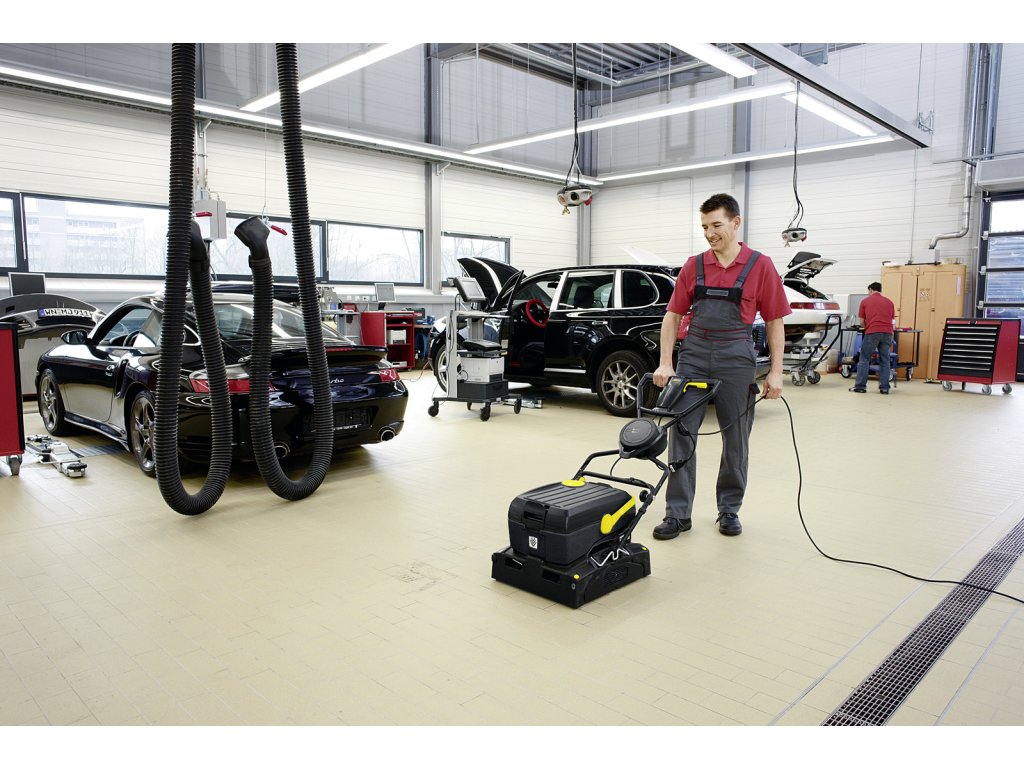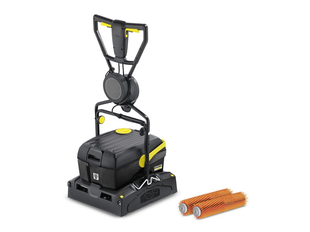 90. výročí Kärcher: BR 40/10 C Limitovaná edice v černé barvě je flexibilní varianta pro použití v různých aplikacích. Čistí a vysává tiše v obou směrech. Má skládací rukojeť a odnímatelné nádrže, které lze snadno přepravovat pomocí uzamčené rukojeti. Kartáče a sací lišty lze snadno vyměnit během několika sekund bez potřeby jakéhokoli nářadí. Součástí dodávky Limitované edice jsou dva oranžové válcové kartáče s různě dlouhými štětinami, ideální pro pro čištění strukturovaných podlah a hlubokých spár.