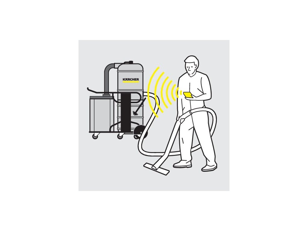 Volitelné rádiové dálkové ovládání k zapínání stroje na vzdálenost až 100 metrů. Pohodlné a časově úsporné ovládání stroje díky odstranění zbytečného přecházení. Optimální využití prostoru. Vysavač lze uložit v nepoužívaných nebo bezpečnostních prostorech.