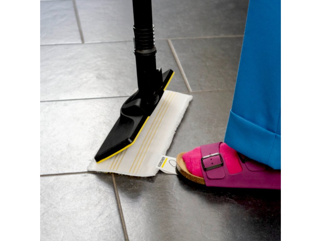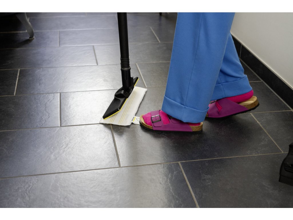 Sada utěrek na čištění podlah EasyFix obsahuje dvě vysoce savé a odolné utěrky na podlahy z vysoce kvalitních jemných vláken pro podlahovou hubici EasyFix. Textilní tkanina se speciální smyčkovou strukturou zajišťuje obzvláště dobré zachycení nečistot. Vysoká propustnost páry umožňuje vynikající a hygienické výsledky čištění - i rohy a hrany jsou čisté během okamžiku. Díky systému háčků a smyček lze utěrky na čištění podlah snadno a rychle připevnit k podlahové hubici parního čističe: stačí je přitisknout na podlahovou hubici EasyFix a je hotovo. Během práce zůstává utěrka bezpečně umístěna a nemůže sklouznout. Po skončení čištění lze použitou utěrku z podlahové hubice EasyFix sejmout, aniž by došlo ke kontaktu s nečistotami: stačí sešlápnout patku na utěrce a vytáhnout podlahovou hubici nahoru a pryč od ní.