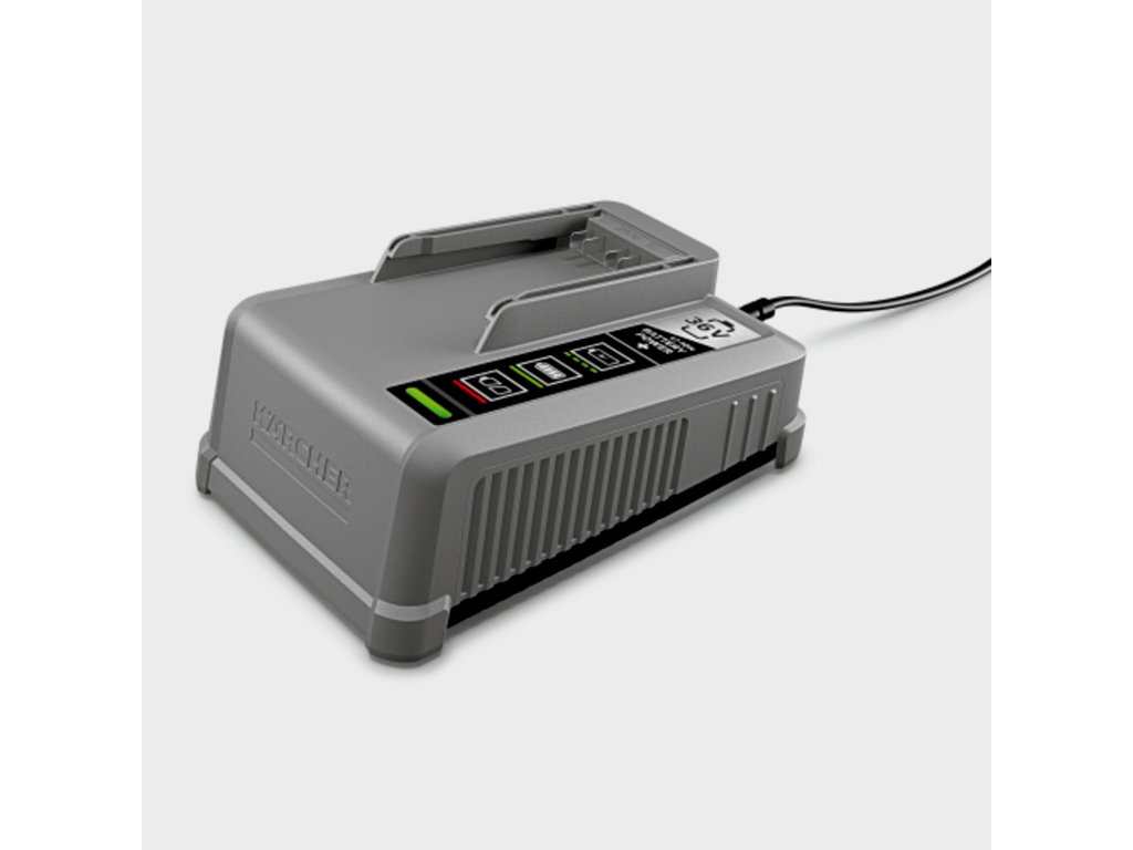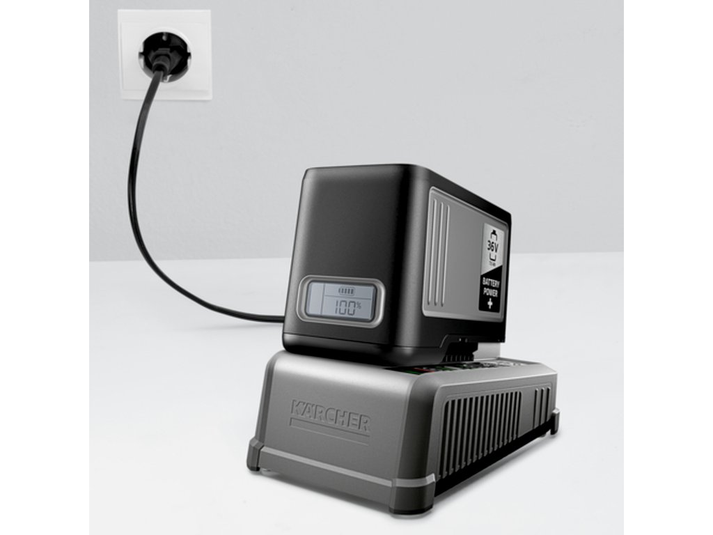 Zaručuje nepřetržitou práci se všemi stroji na platformě 36 V Battery Power + Battery: naše Kärcher Battery Power + 36/60 Starter Kit se skládá z rychlé nabíječky 36 V a 2 výkonných 36 V / 6,0 Ah baterií s inovativní technologií v reálném čase. Díky vysoce výkonné funkci rychlého nabíjení může být jedna z baterií plně nabita, zatímco druhá se používá.
