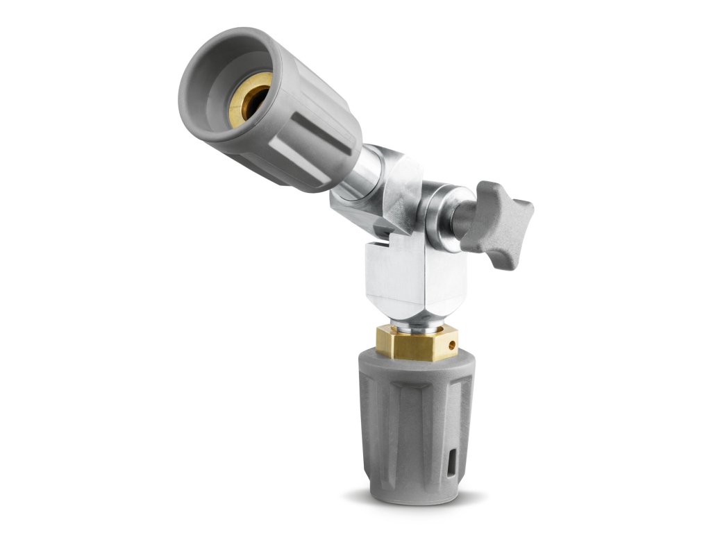 Díky plynulému nastavení úhlu vysokotlakého pružného kloubu až do 120° vyčistíte zcela bez námahy těžko přístupná místa.Rychlé a efektivní čištění strojů, vozidel, podvozků, fasád, střech a mnoho dalších použití. Montáž je velmi snadná a komfortní přímo na pracovní nástavec vysokotlakého čističe.