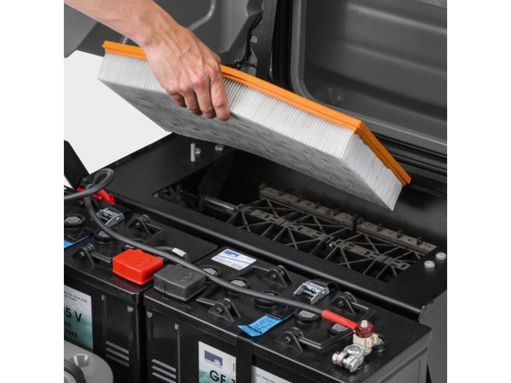 Plochý skládaný filtr z polyesteru. Efektivní očišťování duálními stěrkami pohodlně z místa obsluhy. Přístup k filtru bez použití nářadí díky doširoka otevíracímu krytu stroje.