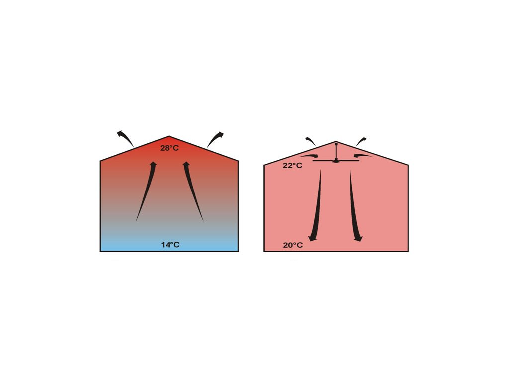 - Energetická ztráta - Vysoká teplota pod stropem vede k odpovídající vysoké energetické ztrátě. → Energetická úspora - Při venkovní teplotě 0°C a redukci teploty pod stropem ze 34°C na 22°C se dosáhne snížení energetické ztráty o 35%.