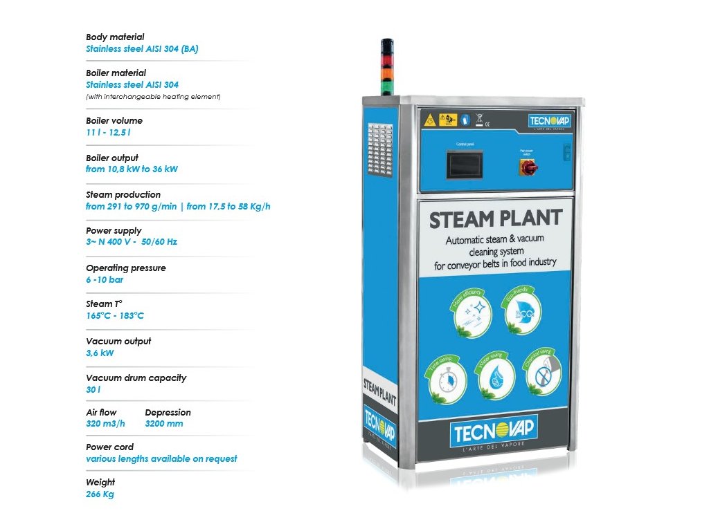 Třífázový parní generátor kombinovaný s automatickým čističem dopravního pásu pro použití v potravinářském průmyslu. Vybaven tělem z nerezové oceli, neomezená autonomie páry díky automatickému systému doplňování vody (elektromechanický systém regulace hladiny vody uvnitř kotle – True Temp™) s přímým připojením k vodovodnímu potrubí. Přední panel se 7" dotykovou obrazovkou pro ovládání zařízení a funkcí čističe pásu.