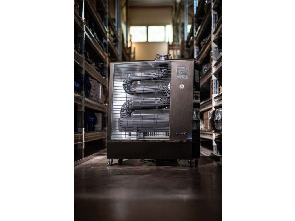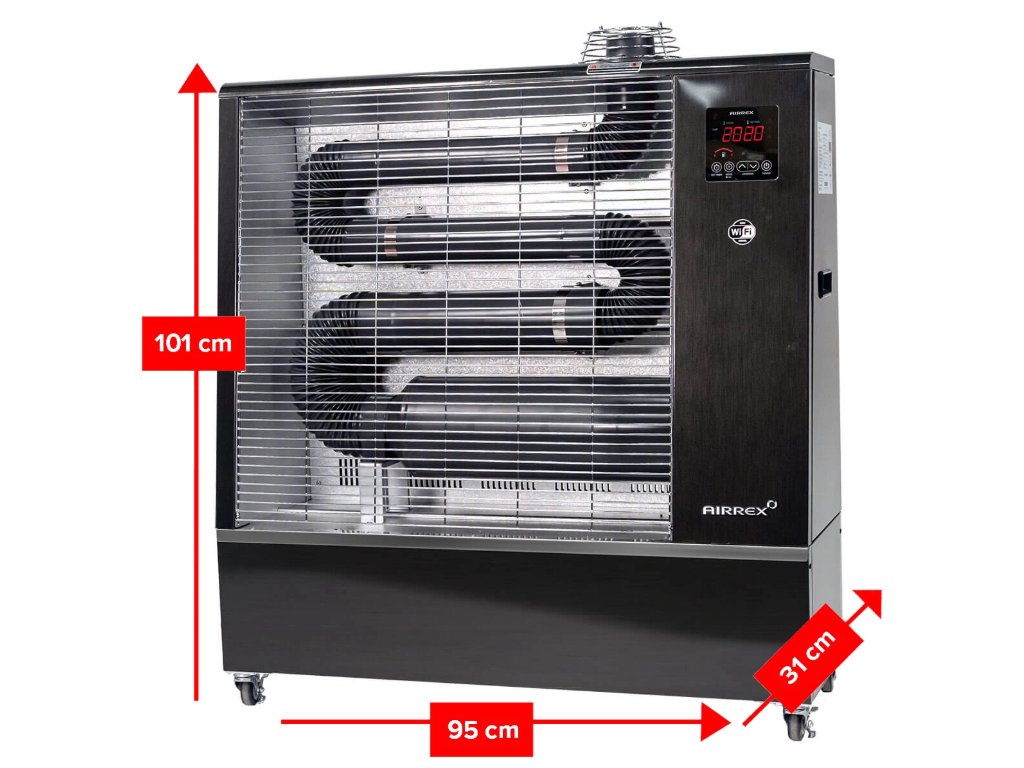 Airrex AH-300i je výkonný 15kW naftový infračervený ohřívač určený pro větší prostory až do 1500 m³, což ho činí ideálním pro sklady, velké dílny, staveniště a průmyslové aplikace. Tato robustní jednotka pracuje na obnovitelné naftě (HVO), standardní naftě nebo červené naftě se spotřebou paliva 1,14 až 1,33 litru za hodinu během nepřetržitého vytápění, ačkoli automatický termostat obvykle výrazně snižuje skutečnou spotřebu v reálném provozu, zatímco jeho objemná 45litrová palivová nádrž zajišťuje prodloužený provoz pro náročné aplikace.