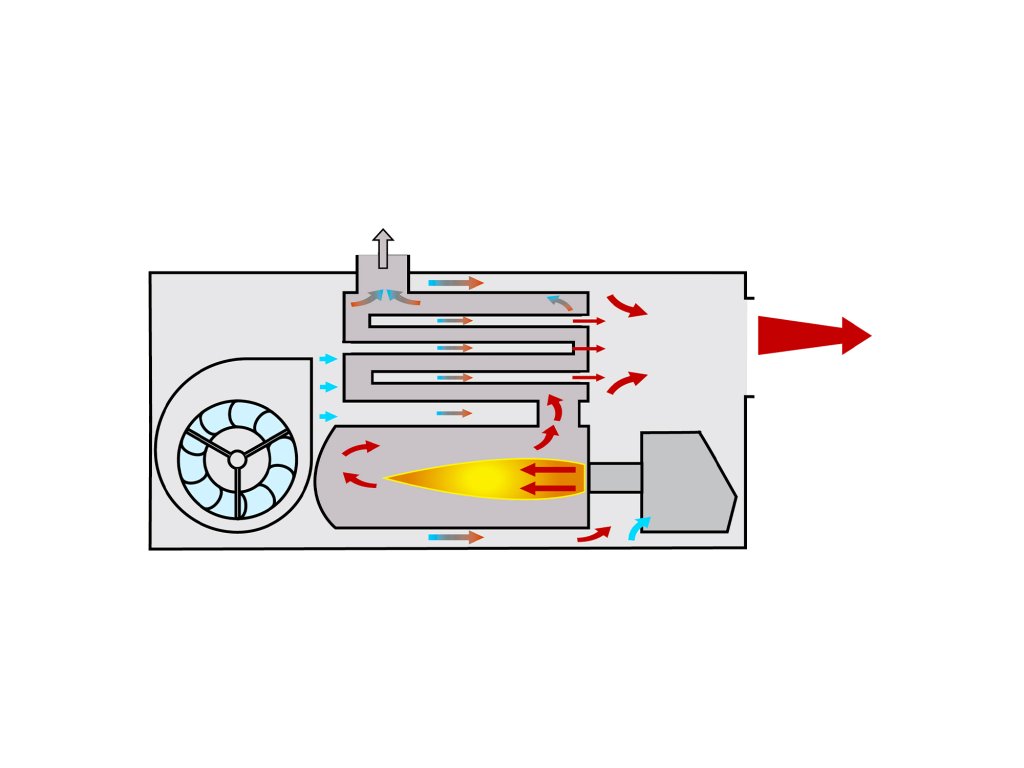 - Radiální ventilátor s vysokým tlakem pro přenos velkého množství teplého vzduchu na velké vzdálenosti.